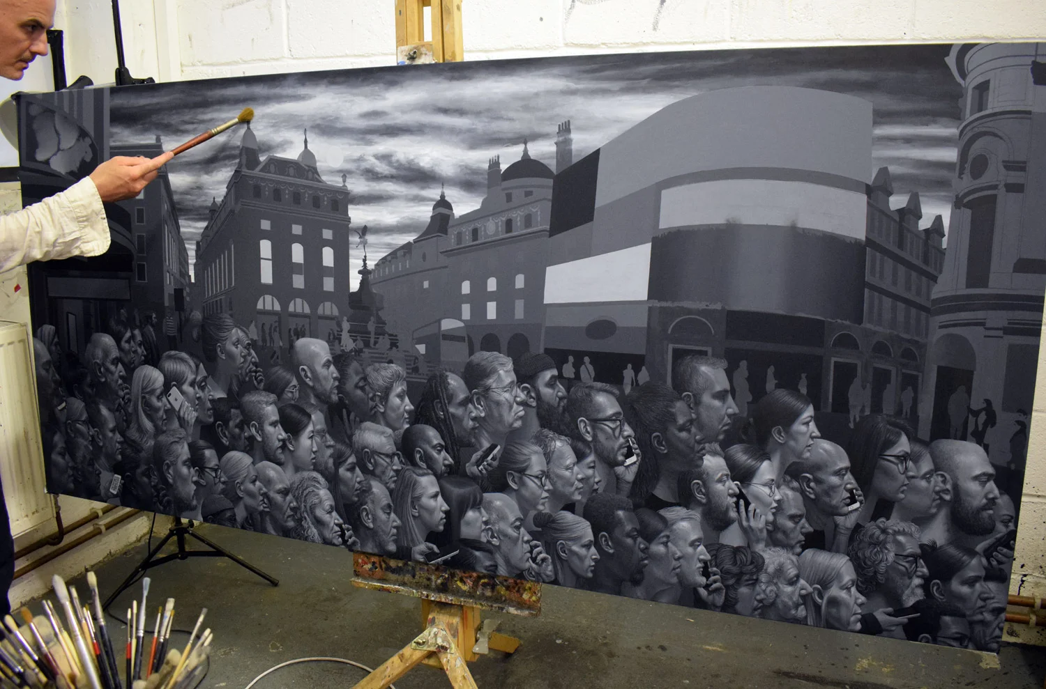 Blending in stormy sky of Piccadilly Circus London painting.